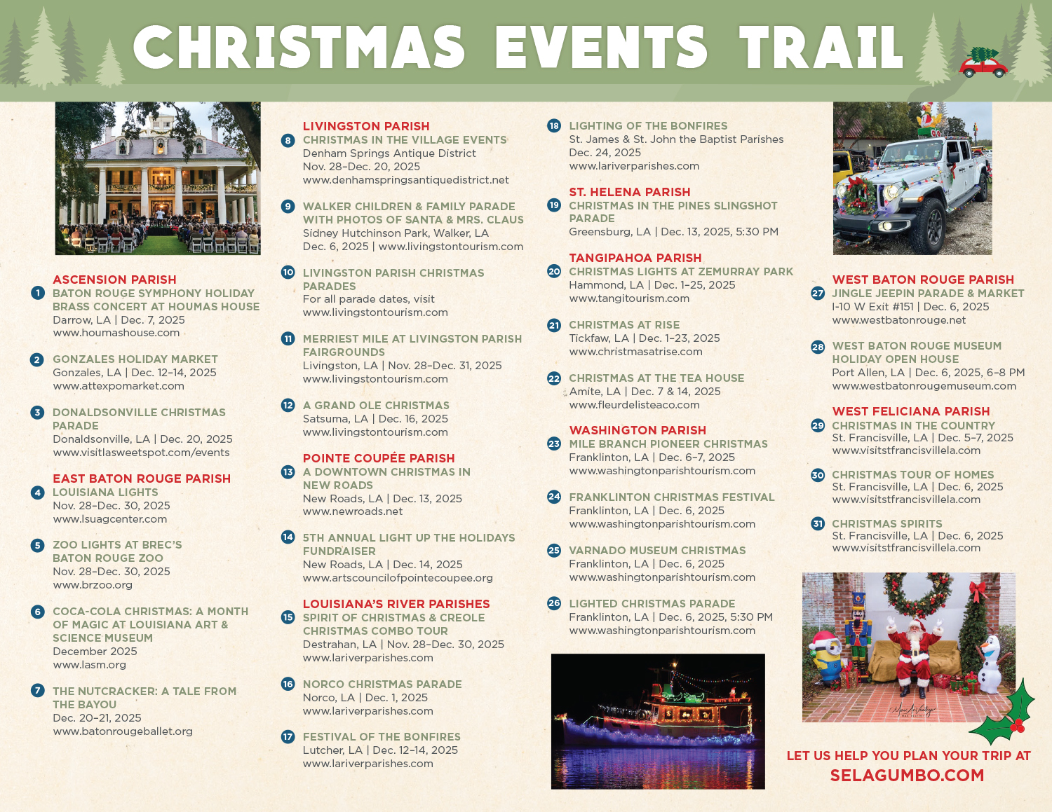 Our Christmas Events Trail is a great way to explore and enjoy the holiday season in Southeast Louisiana. Each parish has a special way to celebrate this special time of the year. The Southeast Louisiana Gumbo Group has designed a Christmas Trail for families and travelers who enjoy experiencing unique Christmas events and attractions. Happy Holidays and we look forward to seeing you on our Christmas Trail.